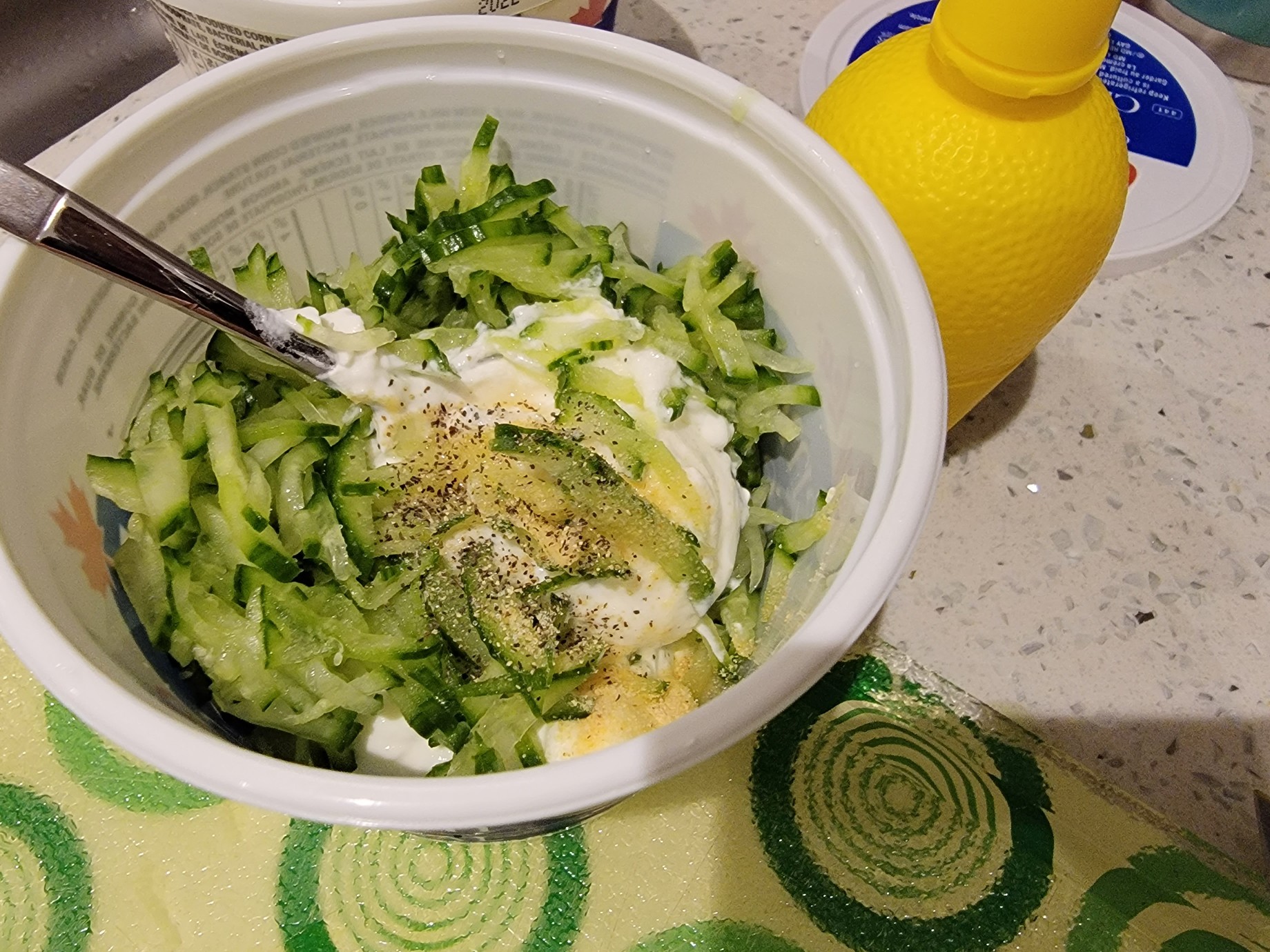 2. 오이를 강판에 갈거나 가늘게 잘라서 손으로 꾹 눌러 물기를 제거 한다.
