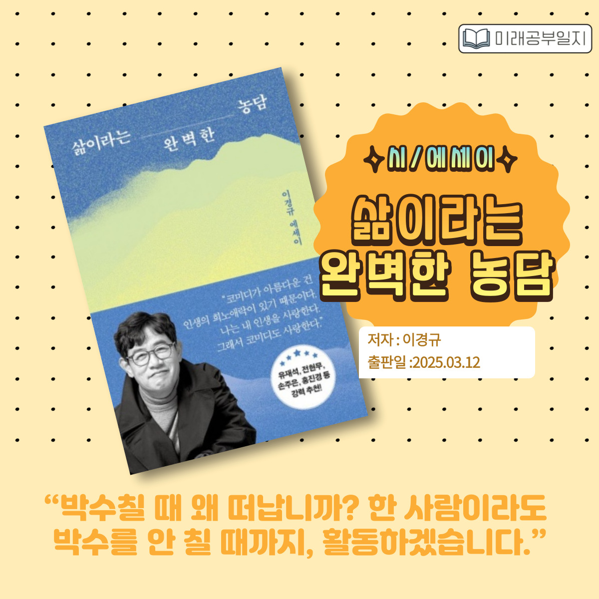 태도를 전합니다. 하지만 이 책은 단순히 가벼운 웃음을 주는 에세이가 아닙니다. 거칠고 울퉁불퉁했던 길 위에서 그가 진심으로 느낀 생각들, 그리고 ‘웃음’이라는 도구로 삶을 견뎌온 한 사람의 기록입니다.