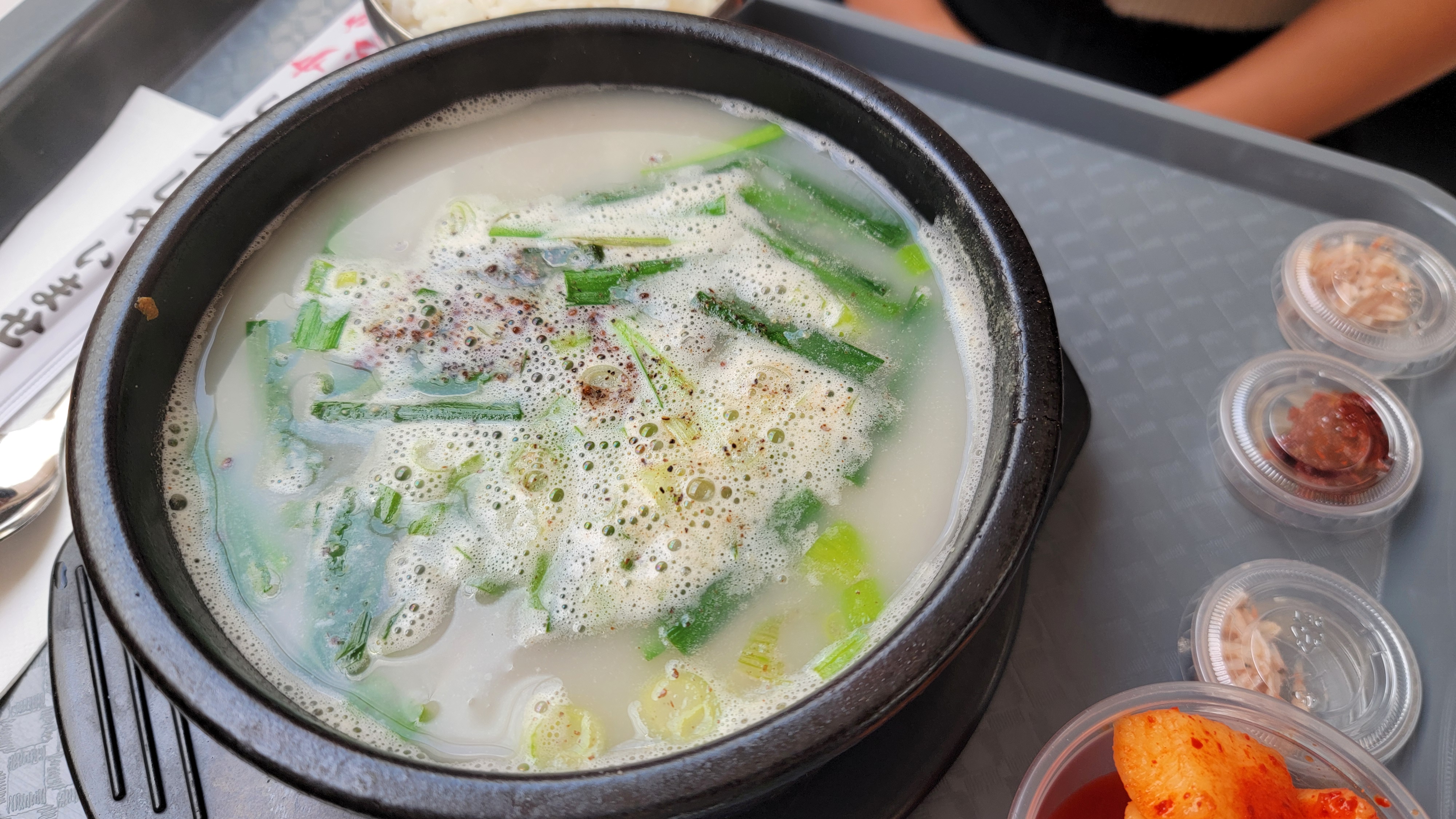 식당 이름은 '멘카츠'지만, 메뉴는 거의 순대국밥 전문점 수준입니다. 가격은 약 13-15 불선 (13,000원~15,000원), 푸짐하고 든든하게 한 끼 해결할 수 있습니다.