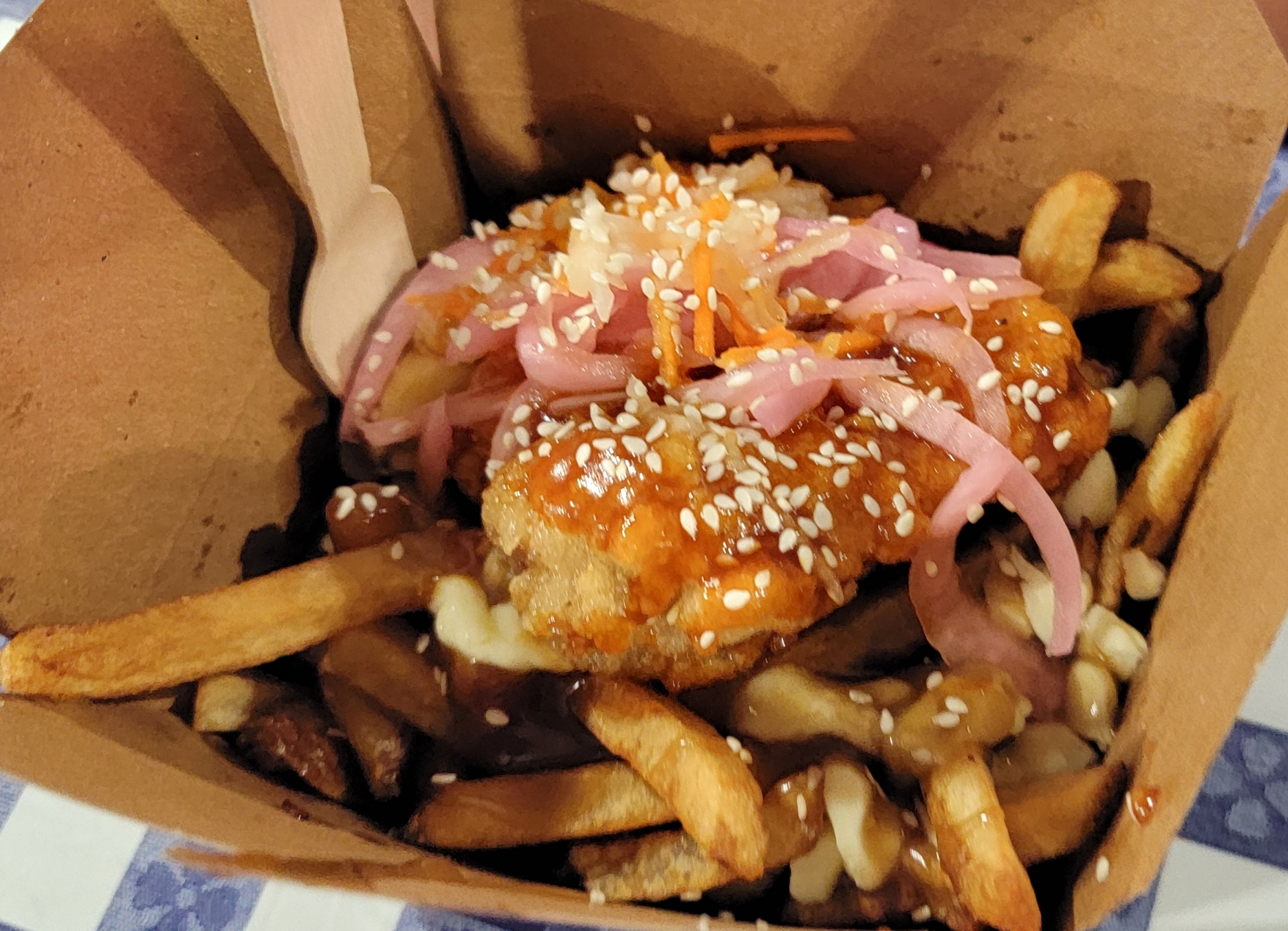 아들이 고른 치킨 푸틴은 감자튀김 위에 그래이비 소스와 모짜렐라 치즈, 그리고 한국식 양념치킨 두 조각이 올려져 있었습니다. 가격은 2만 원이 넘었죠.