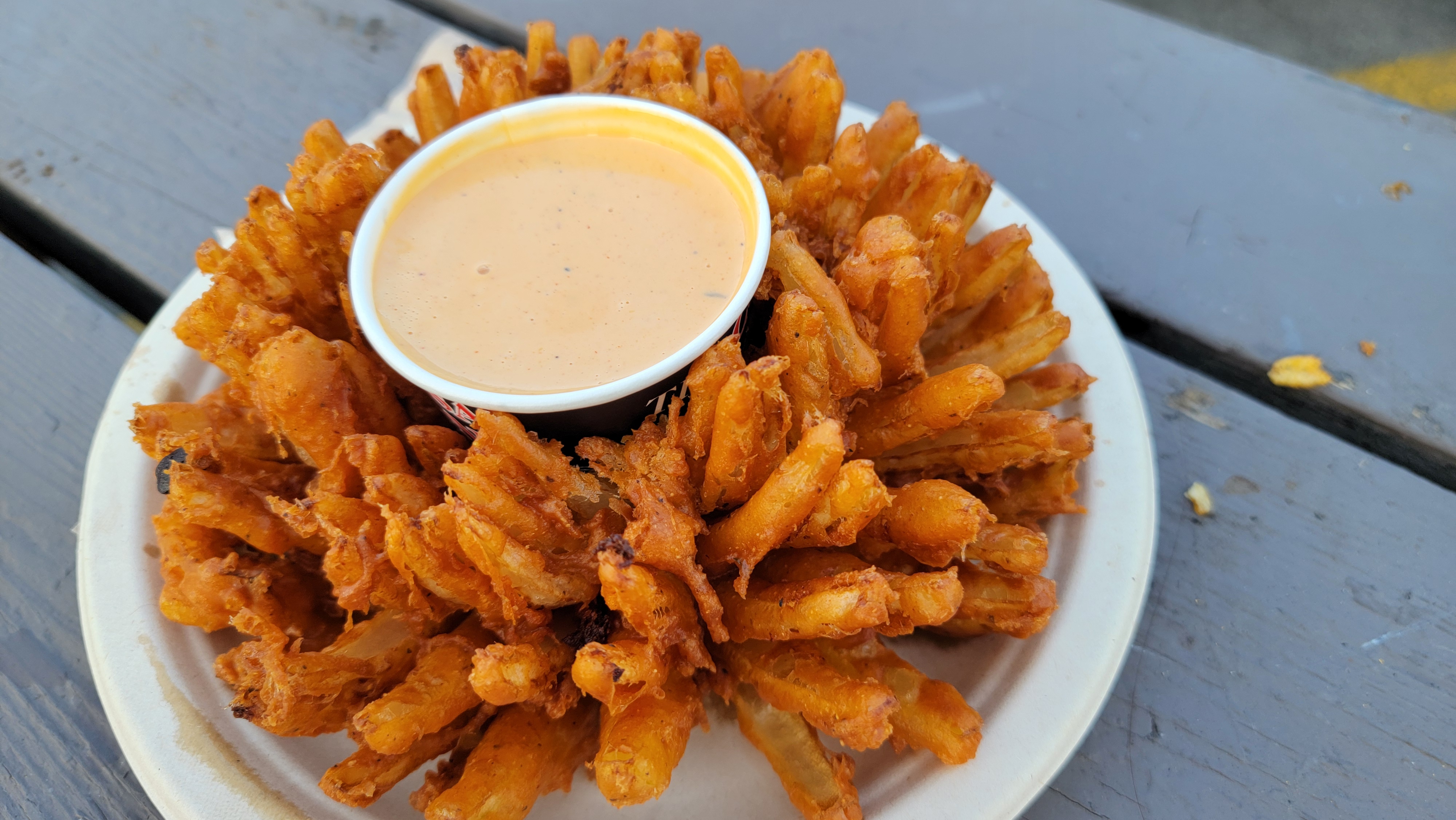 CNE에서 빠질 수 없는 간식 중 하나는 양파튀김입니다. 커다란 양파를 바삭하게 튀겨 특제 소스에 찍어 먹으면 느끼함도 잡히고 계속 손이 가는 맛입니다. 평소엔 튀김을 자제하지만, 이런 축제에 오면 치팅데이가 시작되곤 합니다.