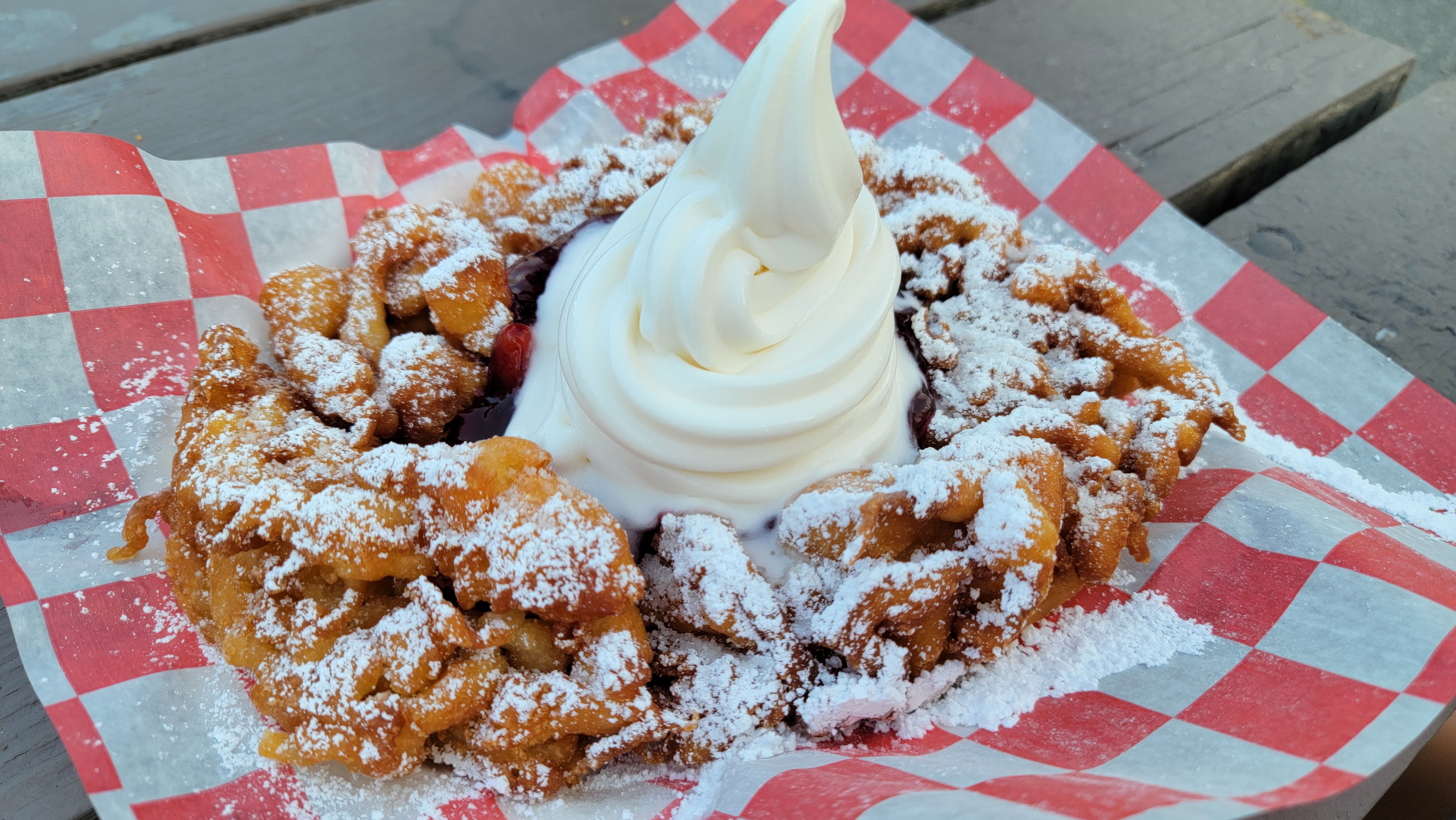또 하나의 대표 간식은 퍼널케이크입니다. 반죽을 깔때기(funnel)로 흘려 구불구불 둥지 모양으로 튀긴 뒤, 딸기 소스와 슈가 파우더, 아이스크림을 올려 먹습니다. 달콤함의 끝을 보여주는 간식이지만, 넷이 먹어도 다 못 먹을 정도로 양이 많고 점점 느끼해지는 단점이 있습니다.