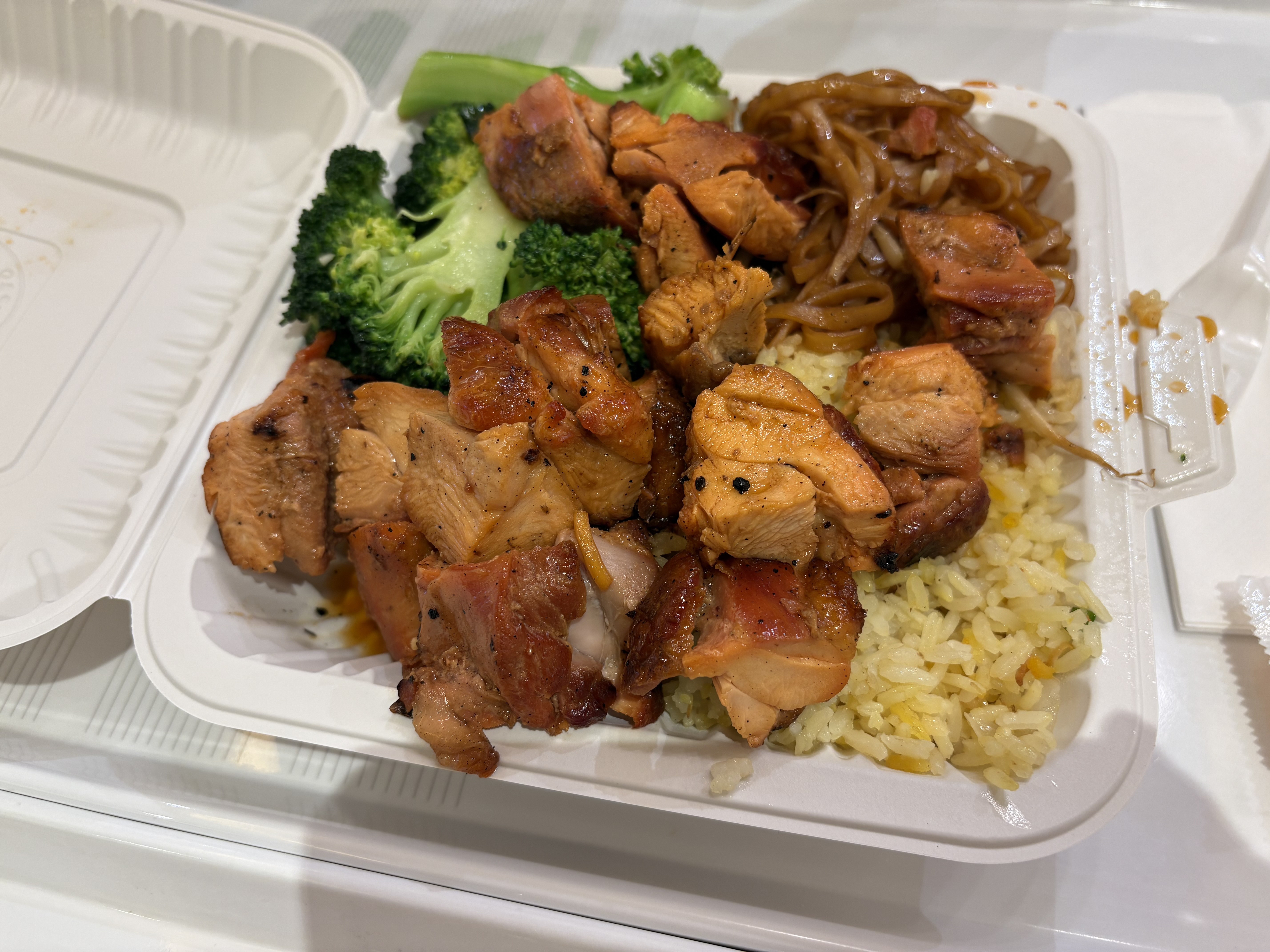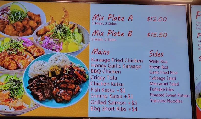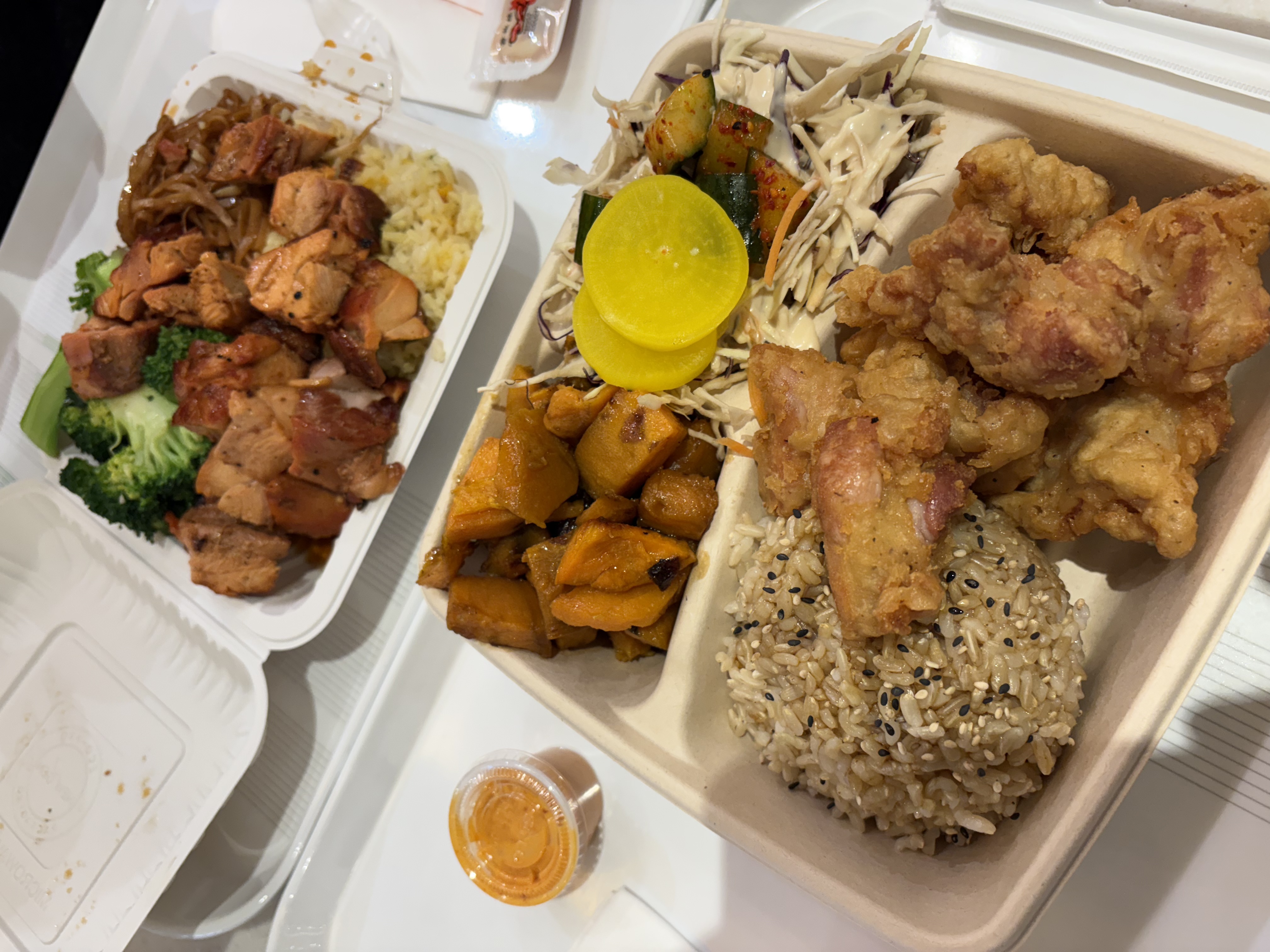 고기1종류 또는 2종류 고르고 야채 하나 고르고 밥이나 누들중에 하나 고르는 식이고 테이크아웃 용기에 가득히 터질듯이 담아주는게 특징이라 양많은 사람들이 너무나 애정하는 곳입니다.