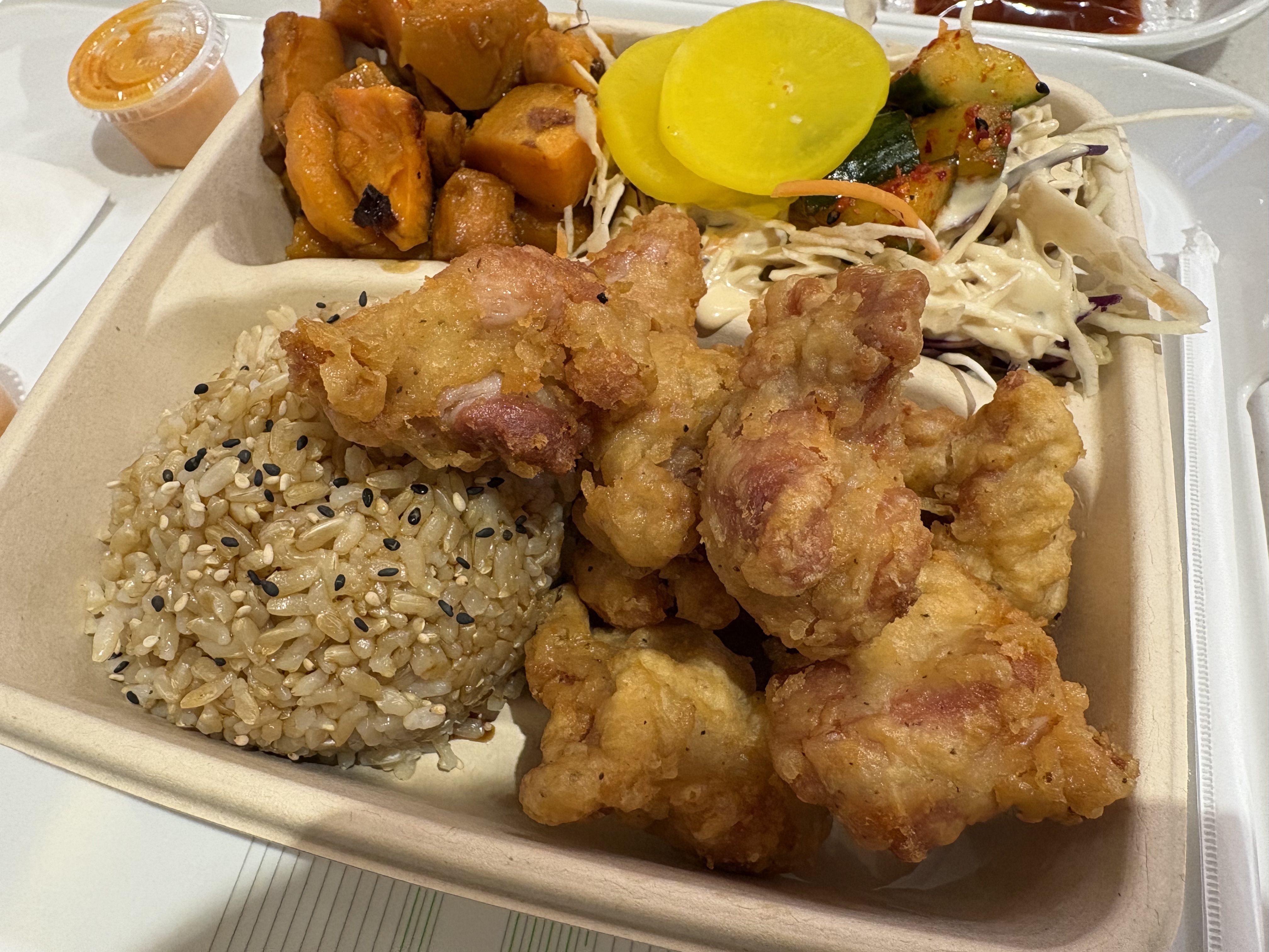 사이드 얌(yam)은 고구마 맛탕 맛인데 겉이 튀기지 않아서 좀 더 부드럽고 양배추샐러드는 참깨드레싱에 일식 돈까스집에서 먹던 딱 그 맛! 느끼함을 잡아주는 한식 오이무침, 단무지도 꼭 필요하더라구요. 스파이시마요도 가끔 찍어먹으면서 뭔가 일식 한식 섞인 느낌이지만 깔끔하면서 배불리 잘 먹었습니다.