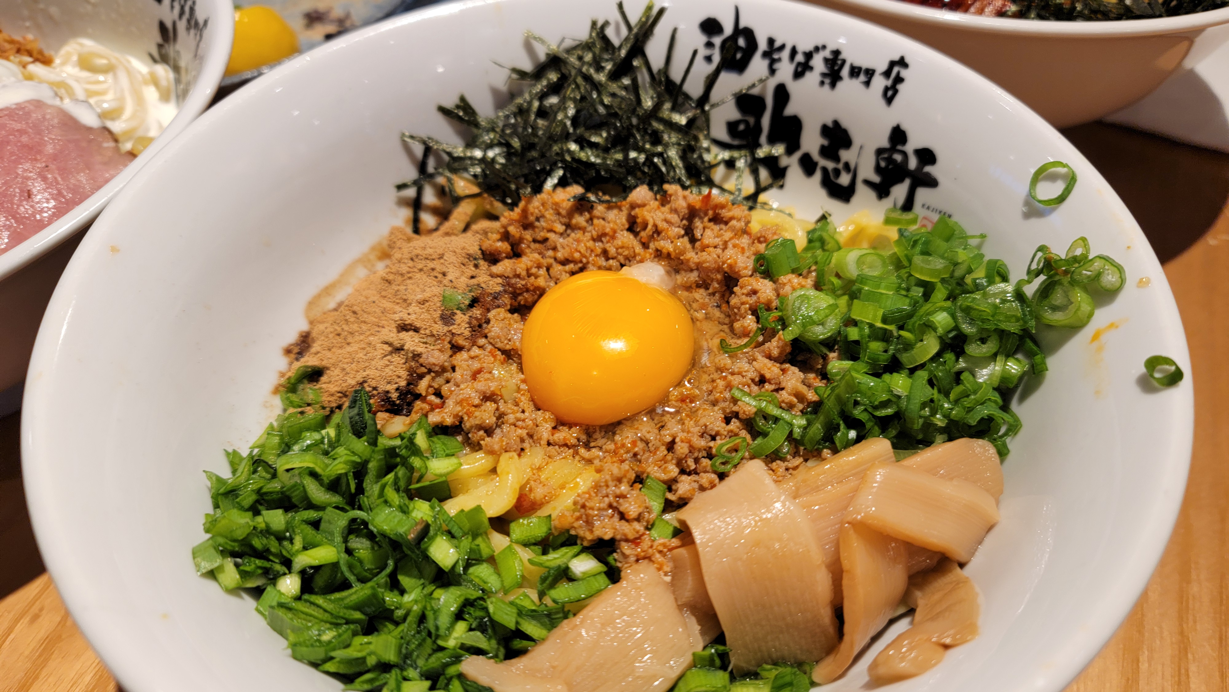 대표메뉴 호무라 아부로소바, 살짝 칼칼하게 볶은 다진돼지고기 고명에 죽순과 생선가루? 그리고 여러 고명에 노른자를 올려놓았습니다.