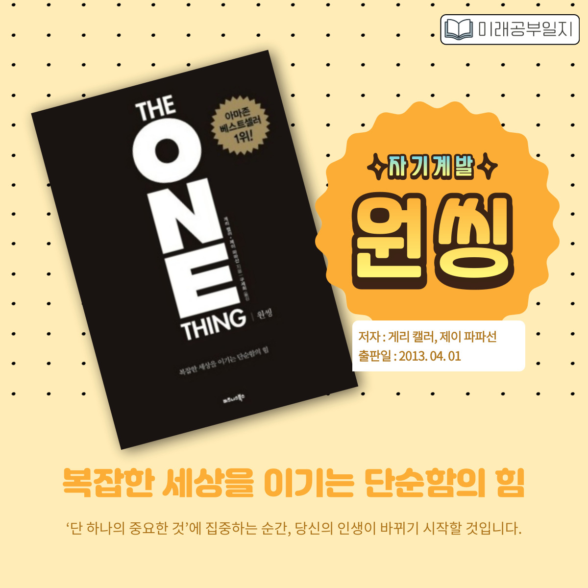 모든 것을 잘하려고 하기보다는 가장 중요한 ‘단 하나의 것’을 찾아 집중하는 것이 진정한 성공의 열쇠라는 것입니다.