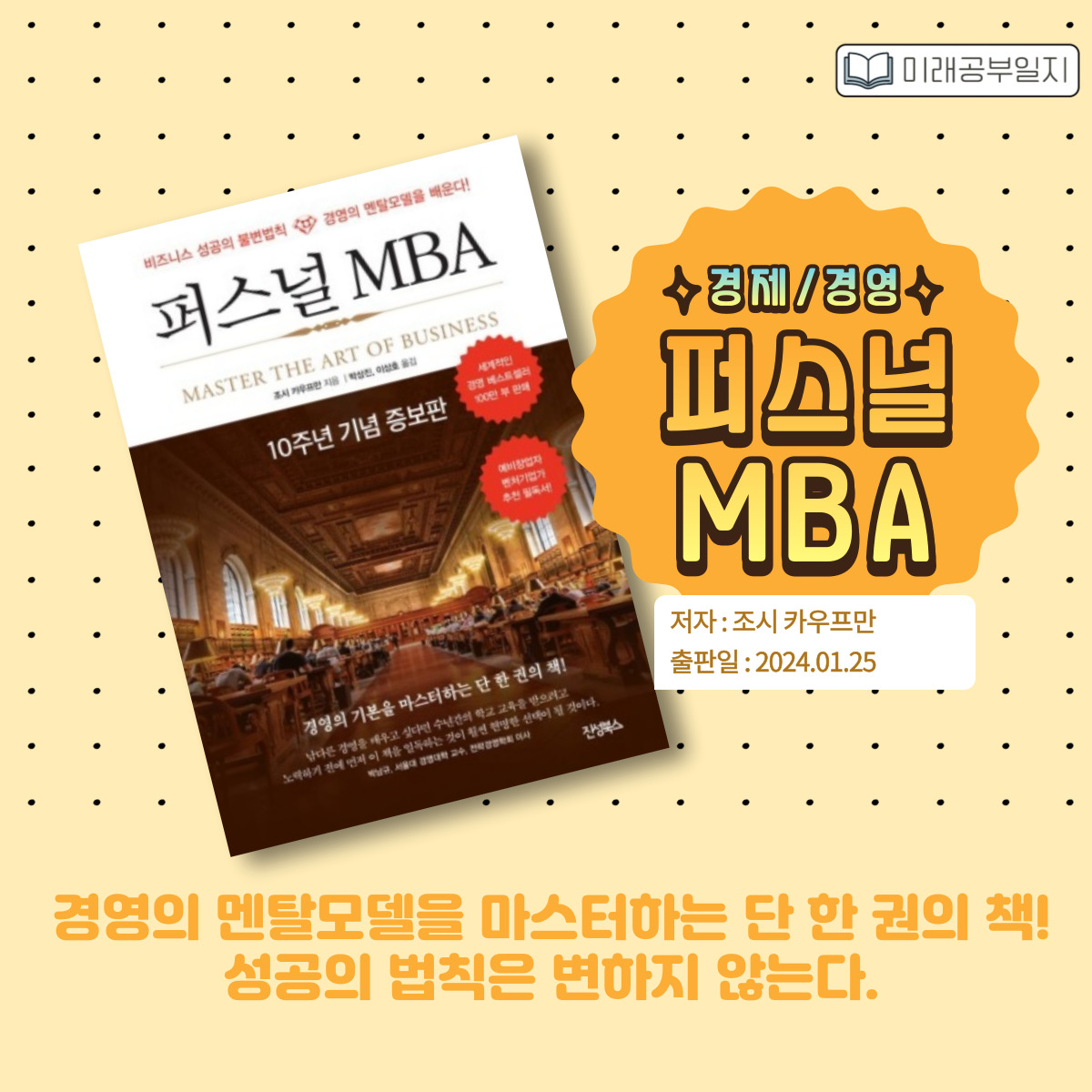 《퍼스널 MBA(The Personal MBA)》는 조쉬 카우프만(Josh Kaufman)이 쓴 책으로, 비싼 경영대학원 과정 없이도 비즈니스의 본질을 이해하고 성공하는 방법을 알려줍니다.