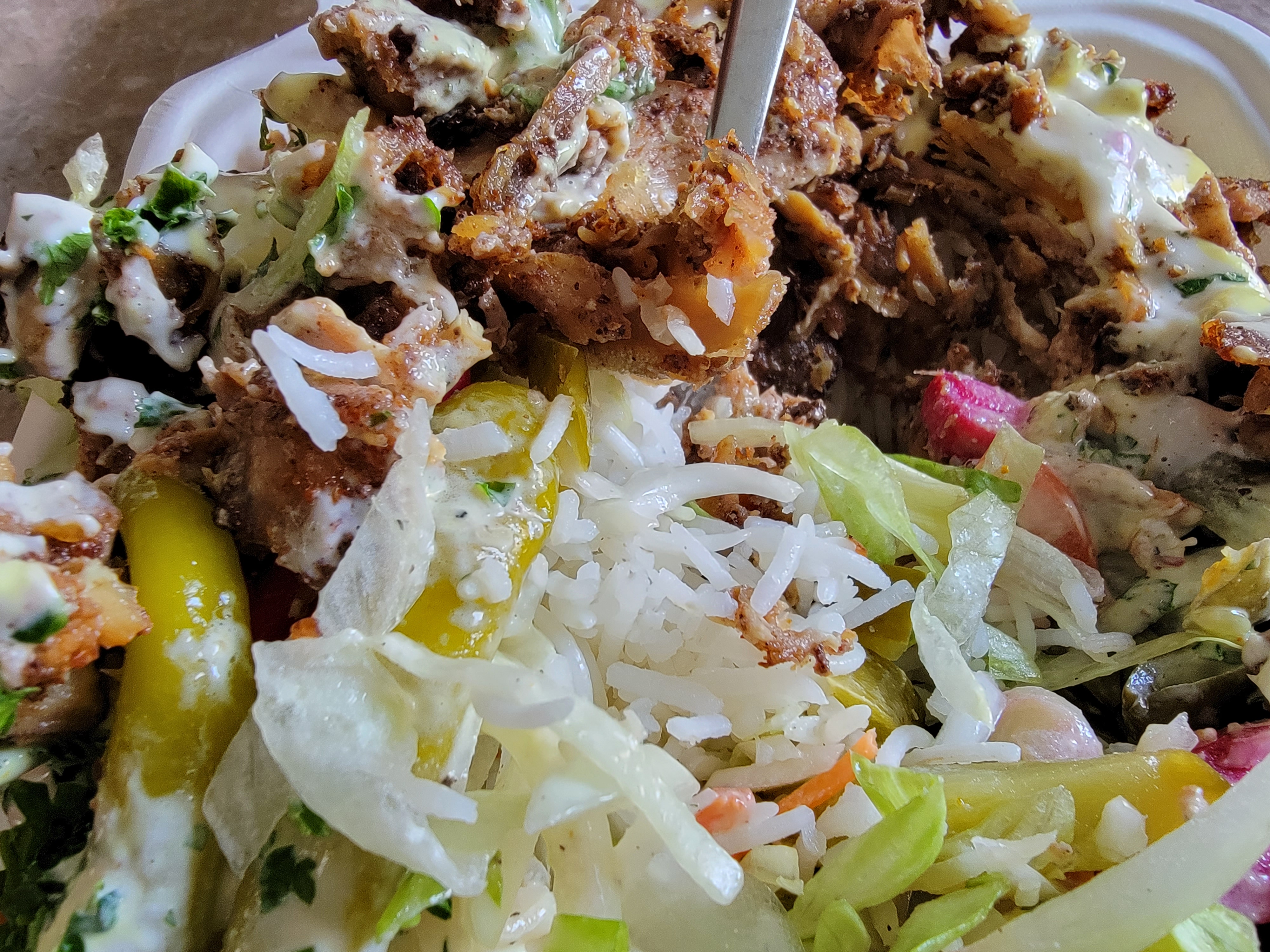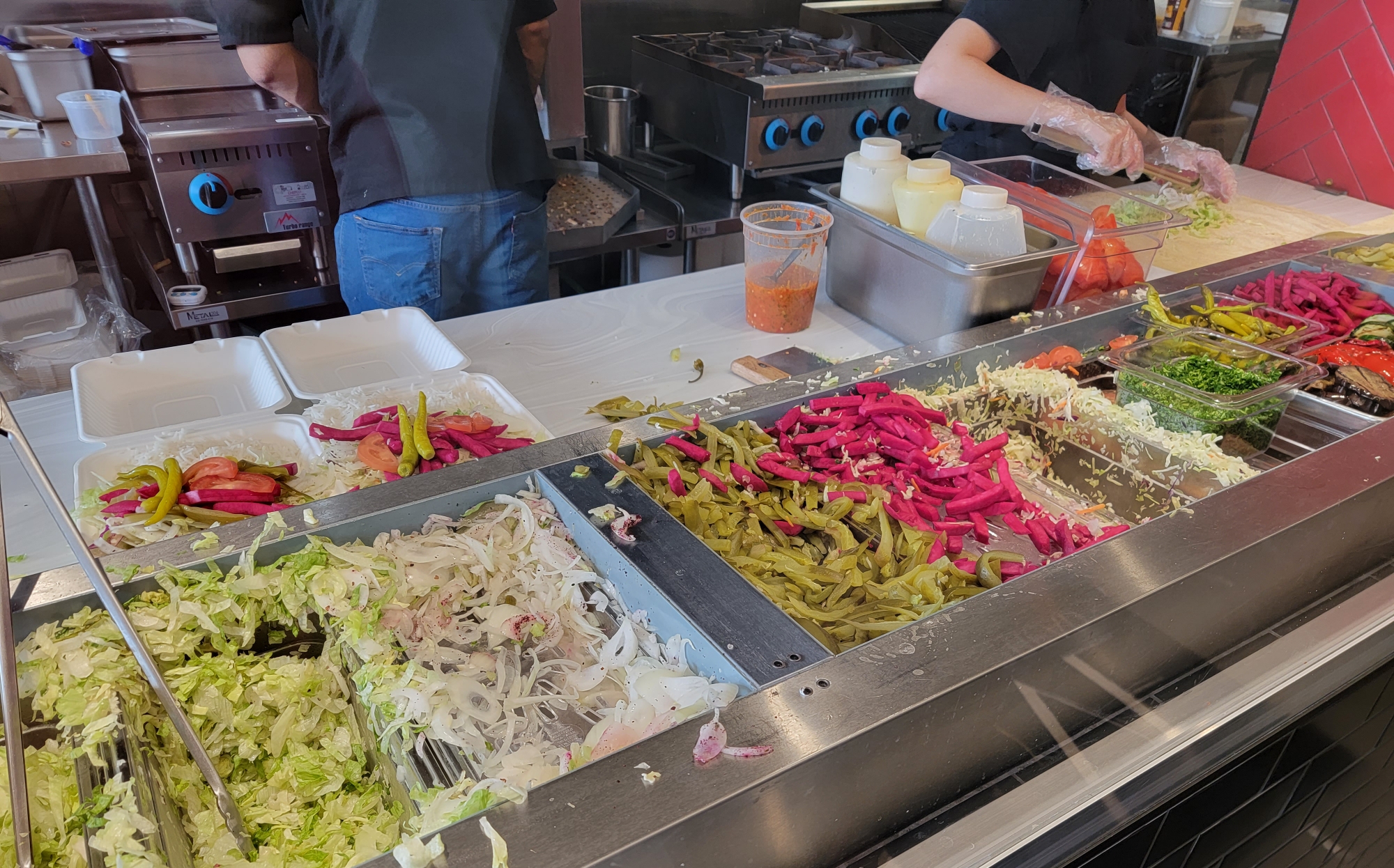 앞쪽에는 항상 저렇게 많은 채소가 있어서 싫어하는 게 있다면 빼 달라고 요청하세요. 양상추, 양파, 양배추, 토마토 가 기본이고 분홍색 순무(turnip)에 옆에도 피클입니다. 절임 채소들이 많아서 기본적으로 새콤함이 있으니 별로 안 좋아하시는 분은 순무와 피클은 빼시면 됩니다.