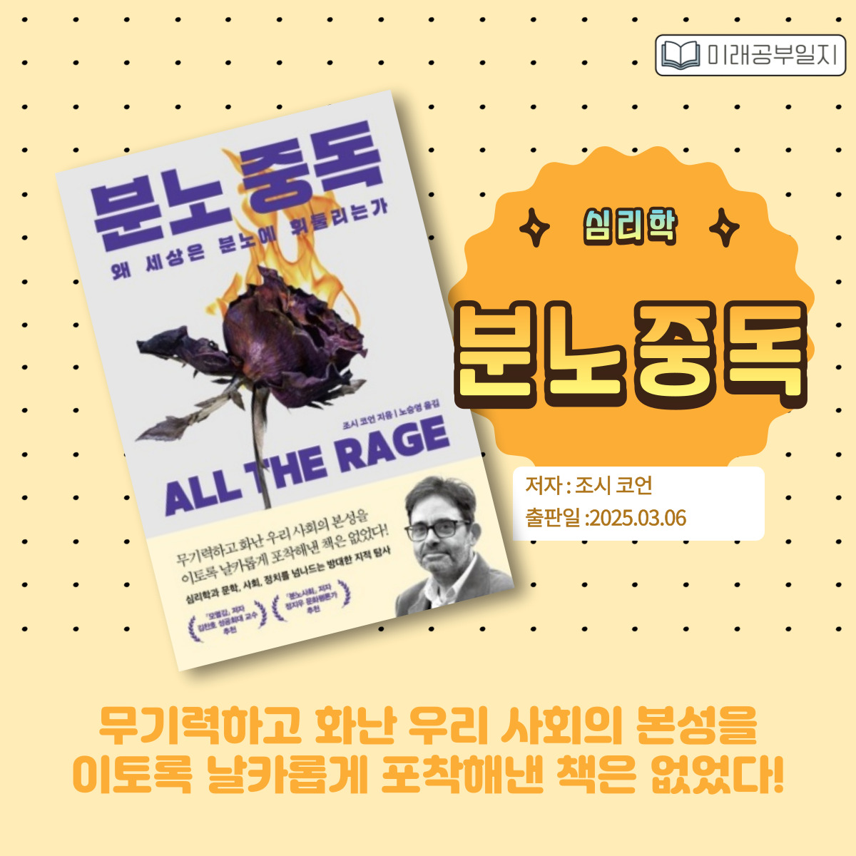 "분노 중독"은 단순한 분노 조절법을 넘어서, 현대 사회에서 감정적으로 건강하게 살아가는 법을 제시하는 책입니다.