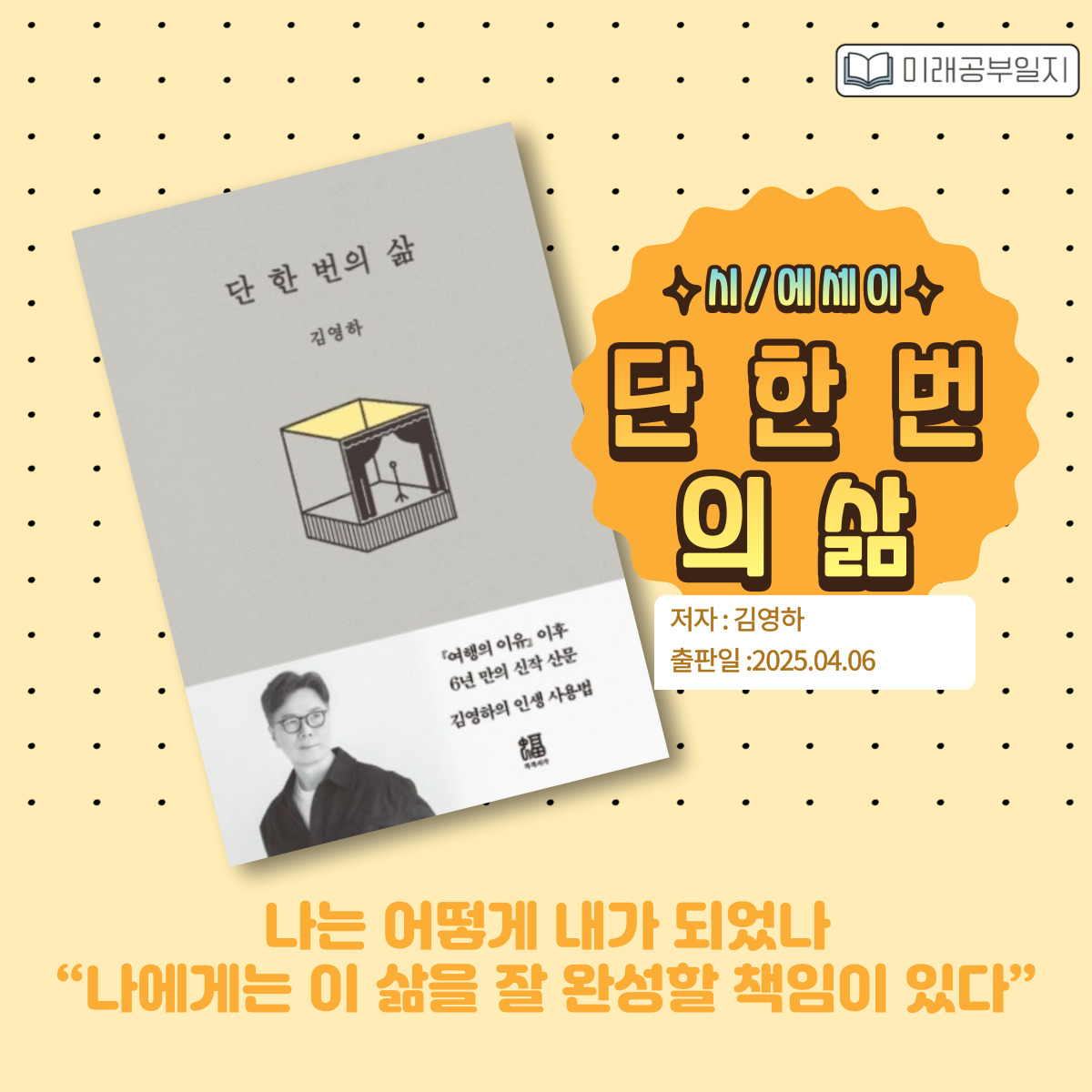 《단 한 번의 삶》은 김영하가 삶, 문학, 고독, 죽음, 사랑, 관계, 존재의 의미를 고민하며 써내려간 짧은 사유의 문장들을 엮은 책입니다. 어떤 질문을 가지고 살아야 할지, 무엇을 추구하며 살아야 덜 후회할 수 있을지에 대한 그의 생각과 책 속에서 발견한 문장들이 담겨 있어, 독자는 이 책을 통해 자기 삶을 성찰하고 단단한 내면의 기준을 만들어갈 수 있습니다.