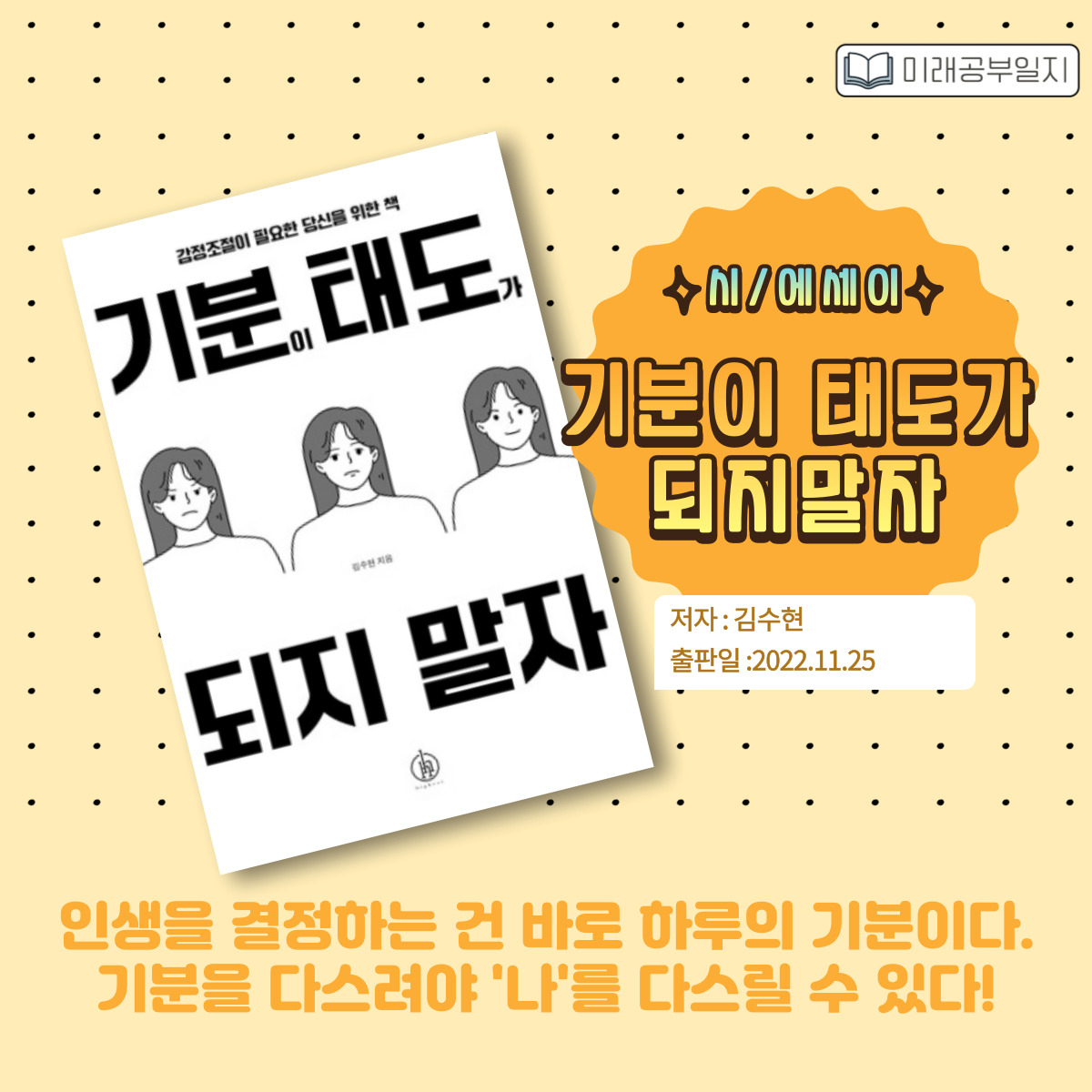 그 동안 미래공부일지에 소개되었던감정을 다스리는 법, 나를 지키는 책 9선을 소개합니다.감정에 휘둘리지 않고, 감정을 이해하고 다스리는 힘을 기르는 책들입니다.1. 기분이 태도가 되지 말
