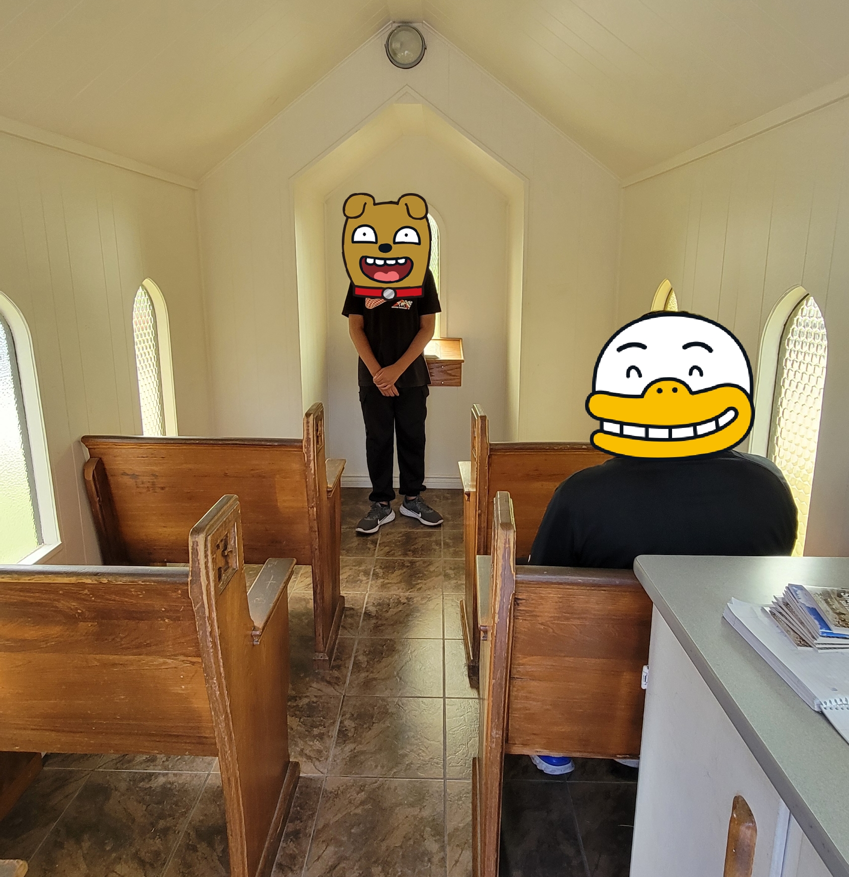 이렇게 딱 4명 정도 앉아서 기도할 수 있는 교회내부가 나옵니다.. 더운 여름철 에어컨은 당연히 없고 창문도 안 열리는 실내라 후덥지근합니다^^