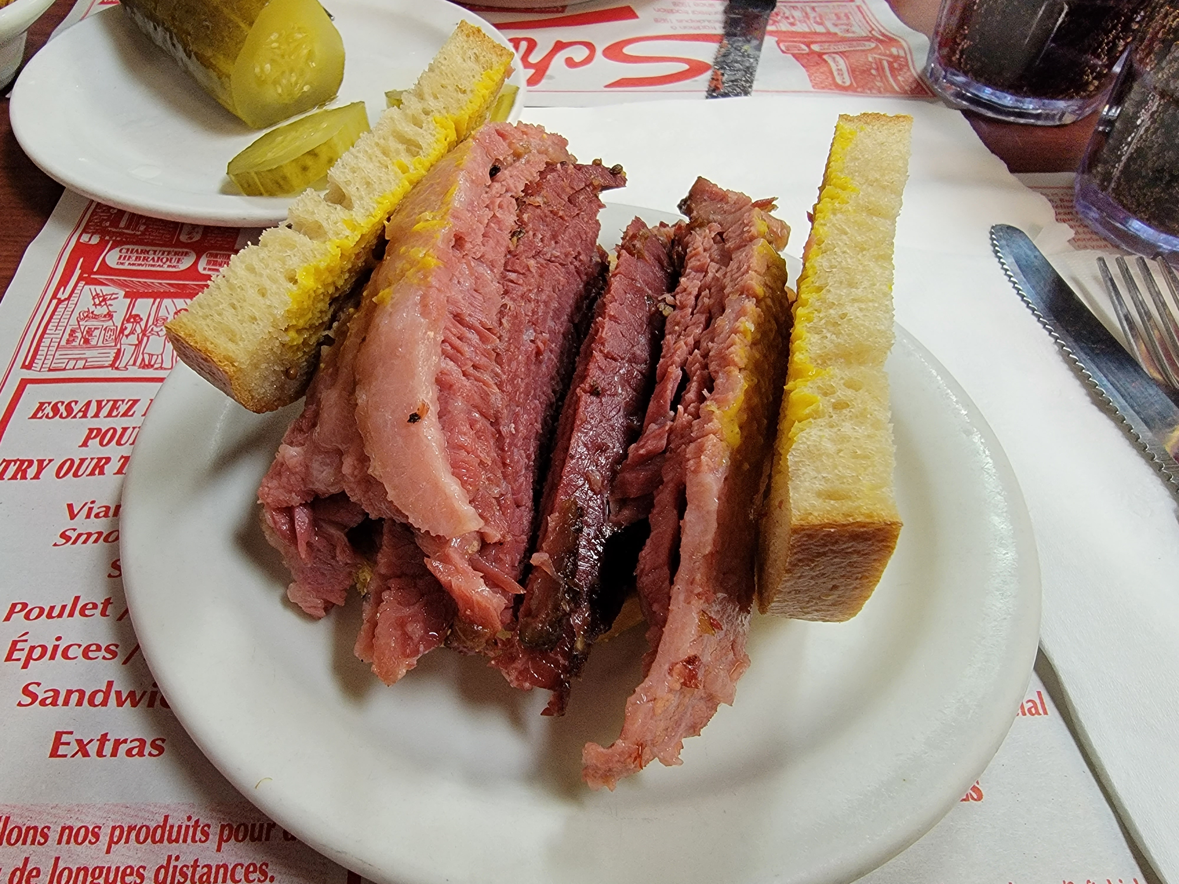 몬트리올의 명물. 큼직한 소고기를 훈제해 얇게 썰어 머스터드 뿌려 낸 샌드위치입니다.