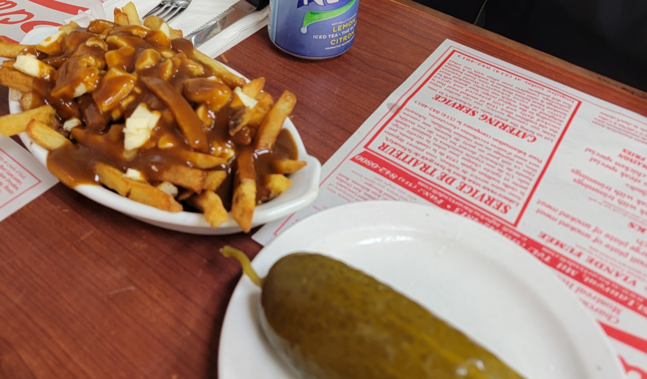 아이들이 캐나다 대표간식인 poutine 푸틴을 너무 사랑해서 하나 주문했습니다.. 좀 느끼할까 봐 피클하나랑요..