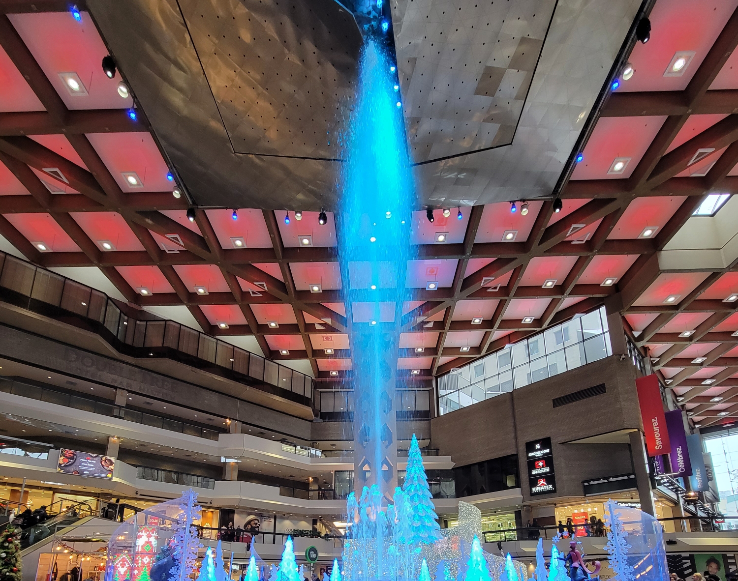 뒤 쪽 분수는 한 번씩 위로 치솟아 천장에 닿을 듯 말 듯~