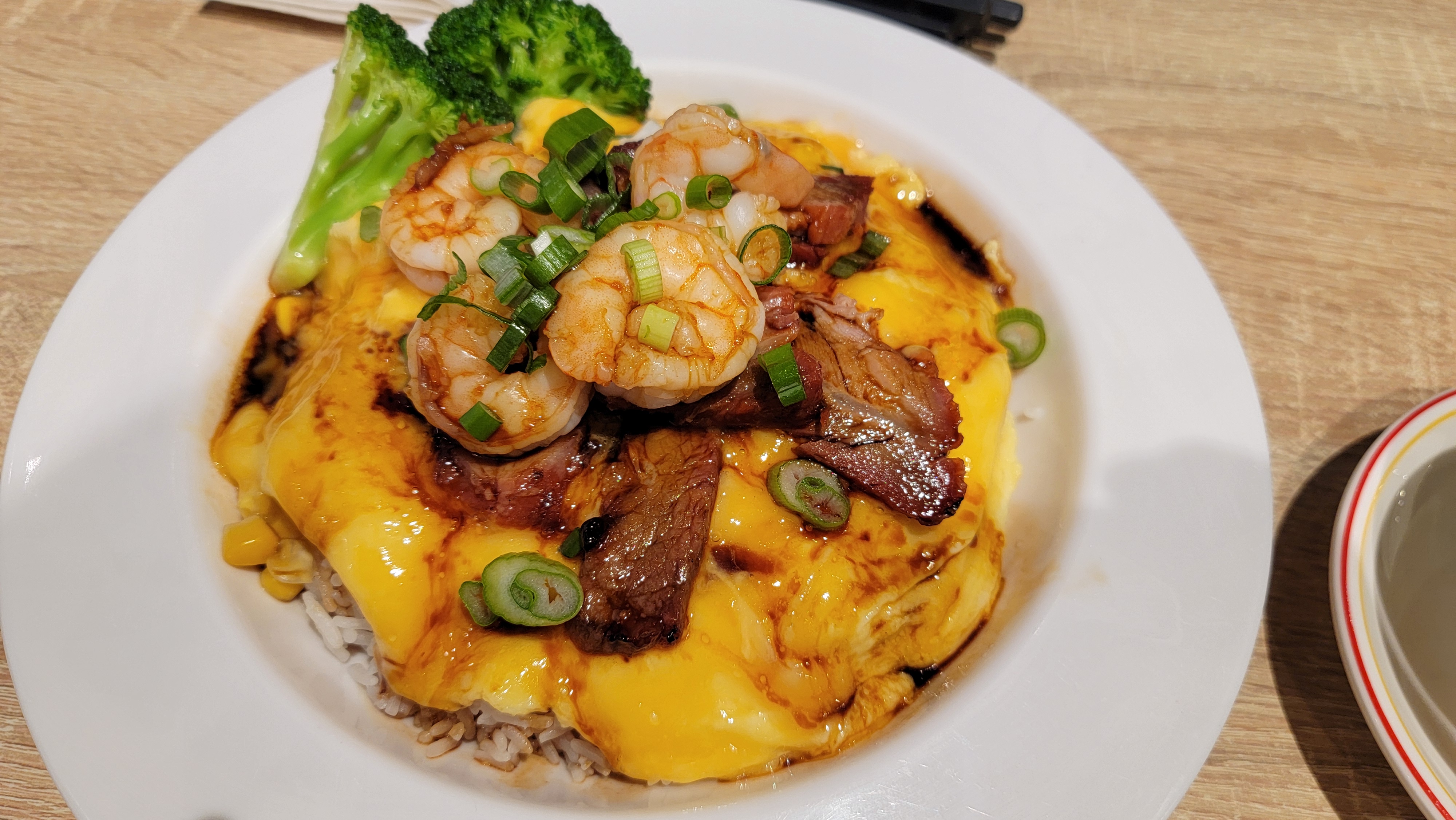 흰 밥 위에 부드러운 계란과 돼지고기 몇 점, 새우 몇 점이지만